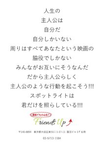 「もし読んでいる漫画の主人公がグダグダで何もせずずっとそのままの漫画だったら、誰が面白いと思う?誰がそんな漫画読みたいと思う?一時ならいい。でもずっとグダグダはだめだ。なんたって見ている方もやっている本人も面白くない!自分の人生だ。自分で面白くするんだろ!」