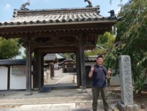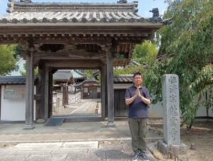 ※お寺に到着。これから入門するところ。来ているTシャツは前日に妻が選んでくれた。