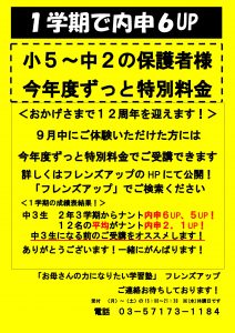 今回、チラシの表題にある「1学期で内申が6アップ」した子は